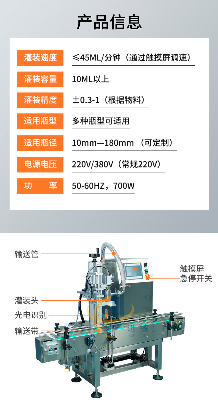 單、灌裝準確、維護方便等特點。該設備整機304不銹鋼制作,與物料接觸面均為食品級材質。料箱可配