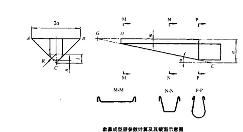 象鼻成型器的制造一般采用不銹鋼薄板,要求外表面光滑乎整。其三角部分和圓弧槽部分可用整塊板料卷曲而成,因為它們的展開寬度是相等的。下圖所示是象鼻成型器結構及展開圖,沿虛線卷折即可制得成型器,圖中參數可通過計算加以選擇。