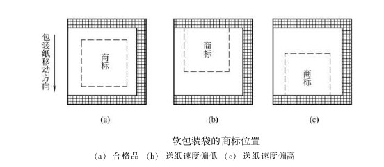 在包裝作業(yè)過程中,卷筒半徑逐漸減小,包裝紙所受張力發(fā)生變化,送紙輥與包裝紙之間的摩擦因數(shù)受環(huán)境溫濕度的影響而發(fā)生波動,加上商標(biāo)印刷誤差,以及送紙、縱封、橫封、切斷各部分速度的差異等因素,使得刀輥的實(shí)際切線偏離規(guī)定部位。即使這種位置誤差很小,例如在某—包裝袋上只偏差0.1mm,但包裝機(jī)速度很快,有的高達(dá)200包/min, 如不加以控制調(diào)節(jié),機(jī)器運(yùn)行1垃i六 后,誤差積累可達(dá)20mm,切線嚴(yán)重偏離規(guī)定部位,降低了包裝質(zhì)量,甚至造成廢品。如圖所示,圖(a)為合格品; 圖 (b) 為送紙速度偏低,商標(biāo)后移; 圖 (c) 為送紙速度偏高, 商標(biāo)前移。 為了保證包裝袋的正確封切, 必須在卷筒紙供送系統(tǒng)中, 引人商標(biāo)圖案自動位置檢測與控制系統(tǒng)。目前應(yīng)用廣泛的是光電自動定位系統(tǒng)。