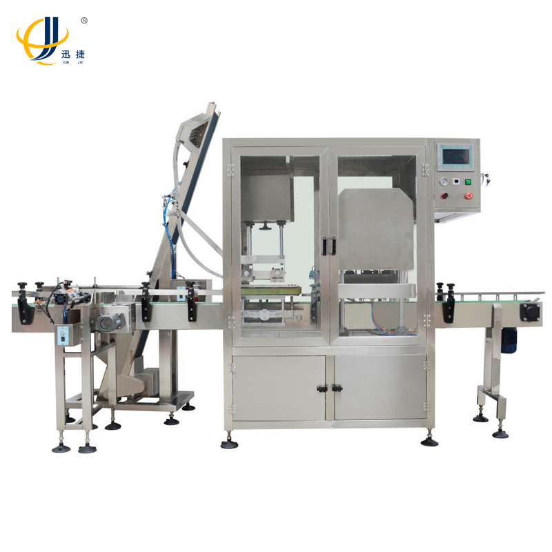 是我公司新研制的玻璃瓶自動上蓋旋蓋的設備,該設備自帶抽真空功能,高效全密封真空室結構,真空度可按需要設定。經該設備抽真空旋蓋的產品,能有效的延長保質期,避免空氣與物品接觸。